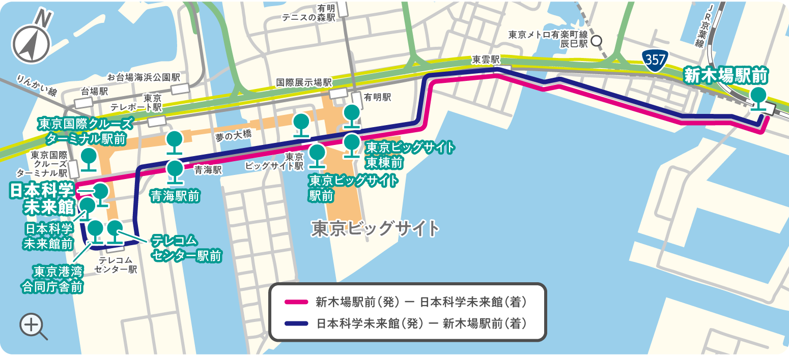 - 事前予約に空きがある場合、「新木場駅前」及び「日本科学未来館」からは事前予約なしでも当日ご乗車いただけますが、先着順のため、乗車定員に達した場合はご乗車できませんので予めご了承ください。