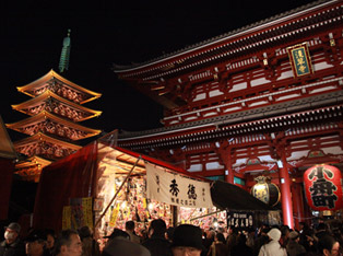 创建于628年,是东京都内历史最悠久的寺院,是老街文化的核心所在,因“浅草观音”之名而备受青睐。从新年首次参拜开始,5月有三社祭、7月有鬼灯节、 12月有毽球板集市等,一年中节假日、祭祀活动诸多,前来参拜和观光的人们络绎不绝。 腊月的毽球板集市堪称冬季一景,有传统的歌舞伎、舞妓式样,还有一年里成为话题的演艺人、运动选手等名人式样的毽球板多达2万种,热闹非凡。