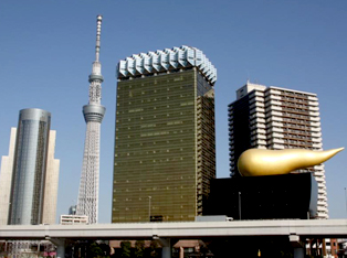 喝着饮料,悠闲地欣赏音乐、美术、舞蹈、戏剧、电影,感受丰富多彩的艺术圣地。 建筑物顶端发出灿灿金光的巨大金色标识是由法国著名设计师Philippe Starck先生所设计的。这个形似燃烧火焰的标识名为flamme d’or(金色火焰),象征着朝日啤酒不断飞跃发展的精神。