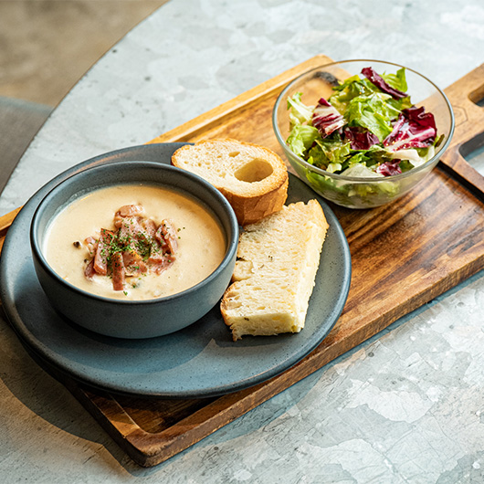 具だくさんの「クラムチャウダー」。ランチはパンかバターライス、サラダ付きで1,650円。
