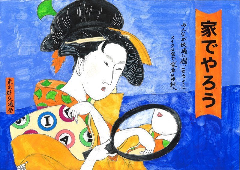「車内でお化粧する人を表現しました。浮世絵に、都営地下鉄と東京都のマークを取り入れ、工夫しました。」