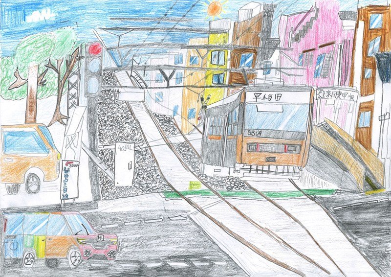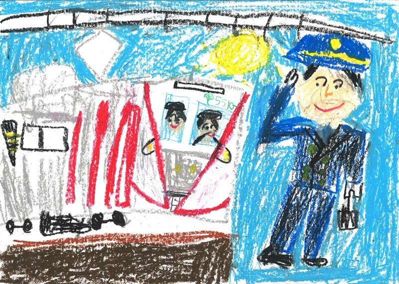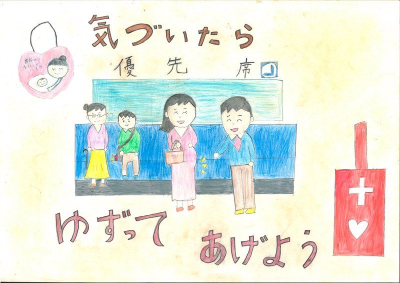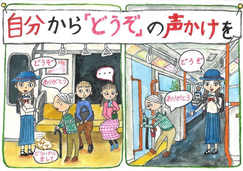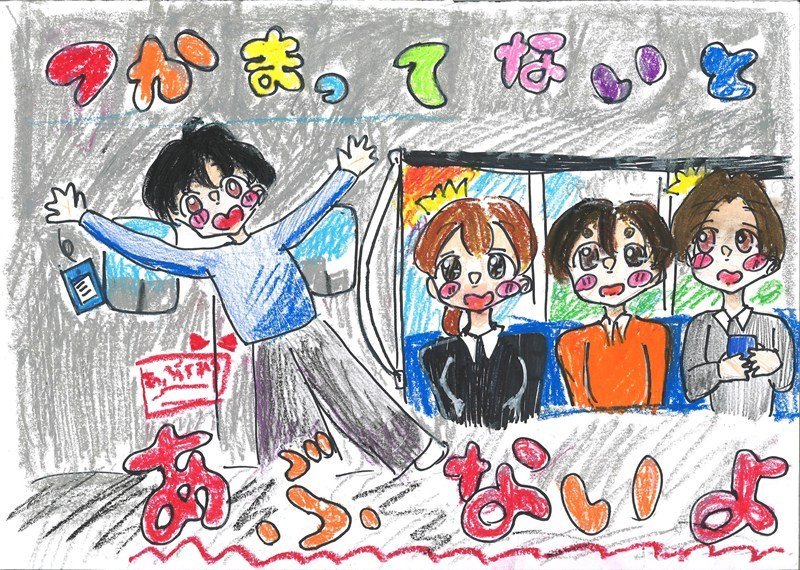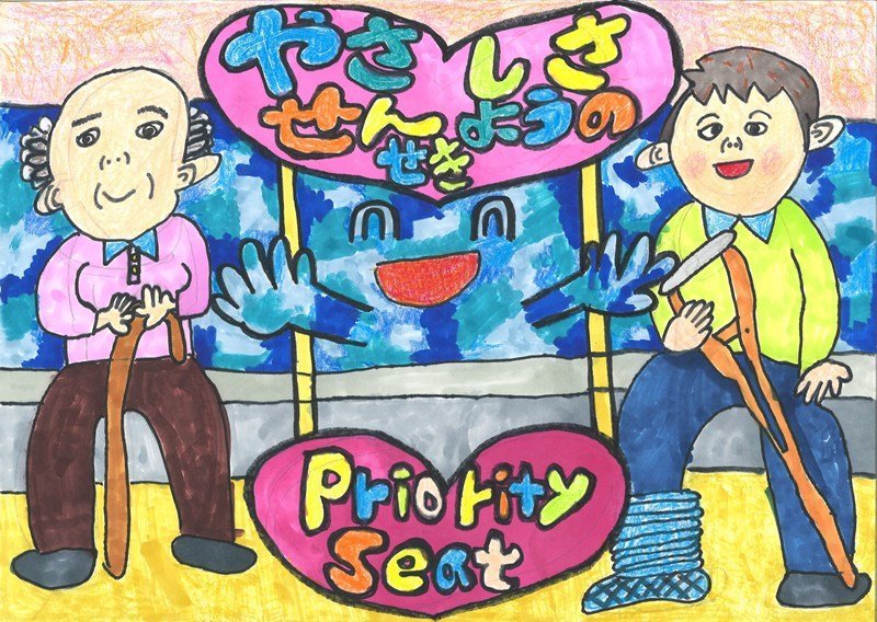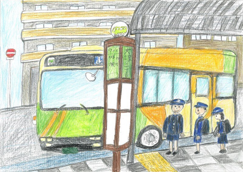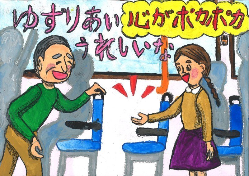 「いろいろな場面で「どうぞ」と声をかけたくなる、そのやさしい気持ちが、二つの場面の描き方からしっかりと伝わってくる作品です。バスや電車の車内の様子も、とてもきれいに、そしてていねいに描かれていますね。細かいところまでよく見て表現しているからこそ、見る人の心に届く、魅力あふれる交通マナー作品になっています。」