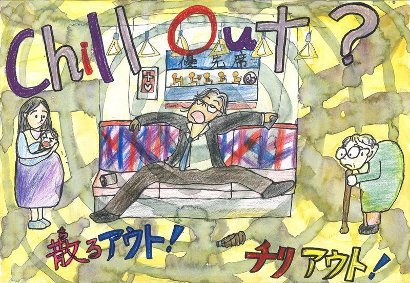 「全身ウエアを着てバスの中で騒いでいる人を中心に描かれた場面が、印象的で面白く、目を引きます。そして、後ろにいる人たちの表情との違いがはっきりと描かれていることで、「しずかにしよう」というメッセージがより強く伝わってきます。色づかいと表情の工夫によって、伝えたいことがしっかりと表現されています。」