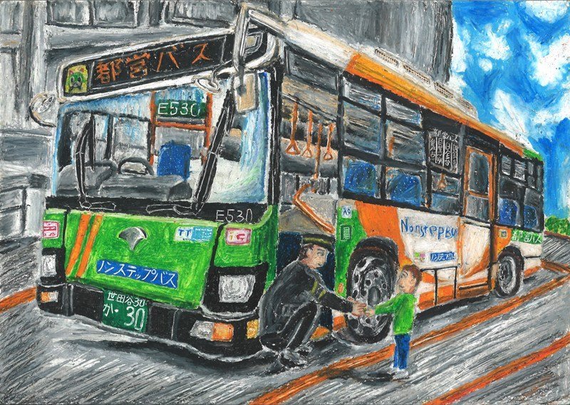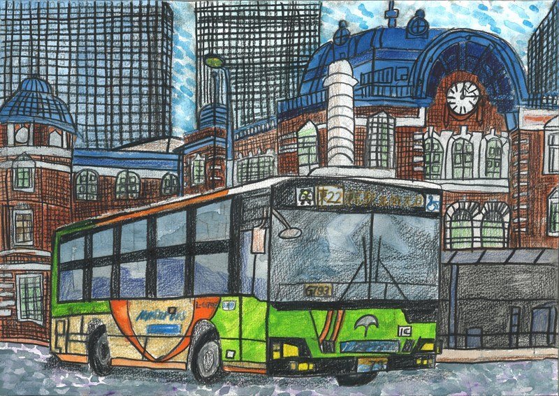 「背景の東京駅と都営バスの構図が堂々と描かれた意欲的な作品です。大きな街への憧れと将来の夢を重ねた前向きな気持ちが、力強く生き生きと表現されています。」