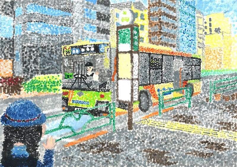 「朝早い通学で運転手さんの「いってらっしゃい」に感じた優しさを、めんぼうの点描画でやわらかく表しました。」