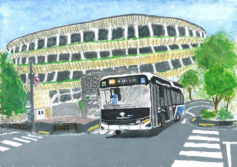 「国立競技場をとても細かく表現し、印象に残ったバスの姿を素直な感動とともに描いています。かっこよさへの純粋な思いが画面いっぱいにあふれ、躍動感のある仕上がりとなりました。」