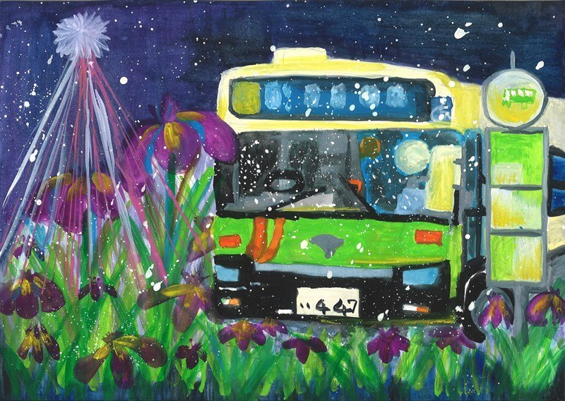 「しょうぶ園と都営バスという地域の誇りを組み合わせた構成が印象的です。日が落ちたあとのライトアップへ向かう情景を想像力豊かに描くことで、ワクワクするような物語性を感じさせます。」