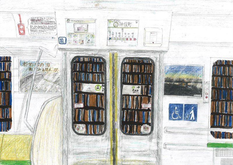 「都営新宿線の日常風景を的確に捉え、本棚をイメージした神保町らしい壁を丁寧に表現した観察力が光ります。画面を構成する視点も素晴らしく、見慣れた景色への愛情が伝わる、優秀な作品です。」