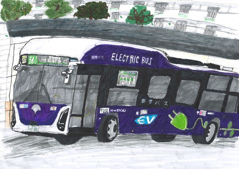 「東京駅に入っていく都営バスを描きました。ぼくも将来大きな街ではたらく都営バスの運転士になりたいです。」