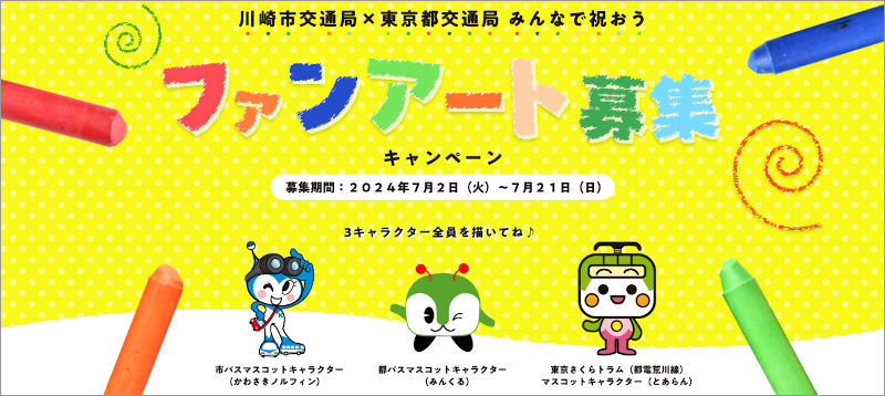 川崎市交通局と東京都交通局は、2024年に、川崎市交通事業が80周年、都営バスが100周年、東京さくらトラム(都電荒川線)が50周年を迎えます。この記念すべき節目を祝うため、両局のマスコットキャラクター(かわさきノルフィン、みんくる、とあらん)を描いてもらうファンアート募集キャンペーンを実施します。募集したファンアートをラッピングしたバスを走らせるなど、みなさまのファンアートが両局の周年イヤーを盛り上げます!