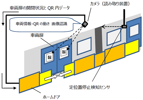 QRコードを車両ドアに貼り、ホーム上のカメラ(読み取り装置)で車両ドア数、編成車両数などの情報やQRコードの動きを検知します。