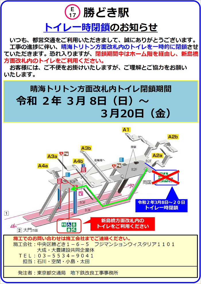 大江戸線勝どき駅改良工事に伴うホーム階段使用開始・トイレ一時閉鎖について