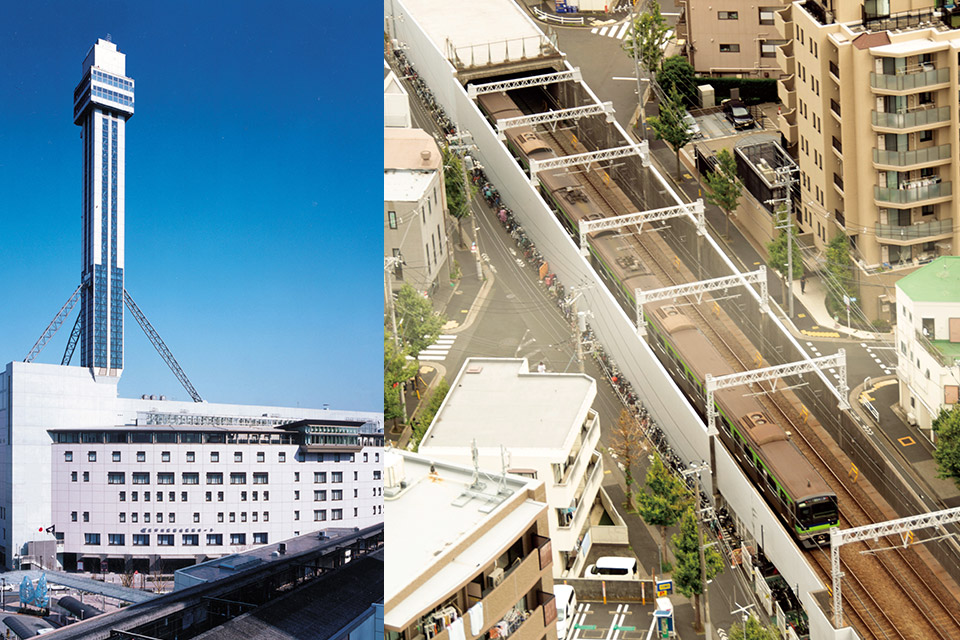 江戸川区のシンボル「タワーホール船堀」の展望室からは、都営新宿線の地上区間を走る電車を眺めることができます。高さ103mとあって、船堀駅に停発車する電車が、まるで鉄道模型のように見えます。東京スカイツリー®を望むことができる絶好のビューポイントでもあり、360°の大パノラマを楽しめます。